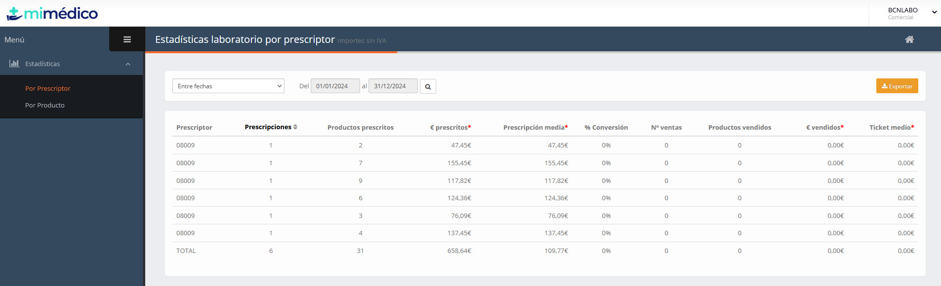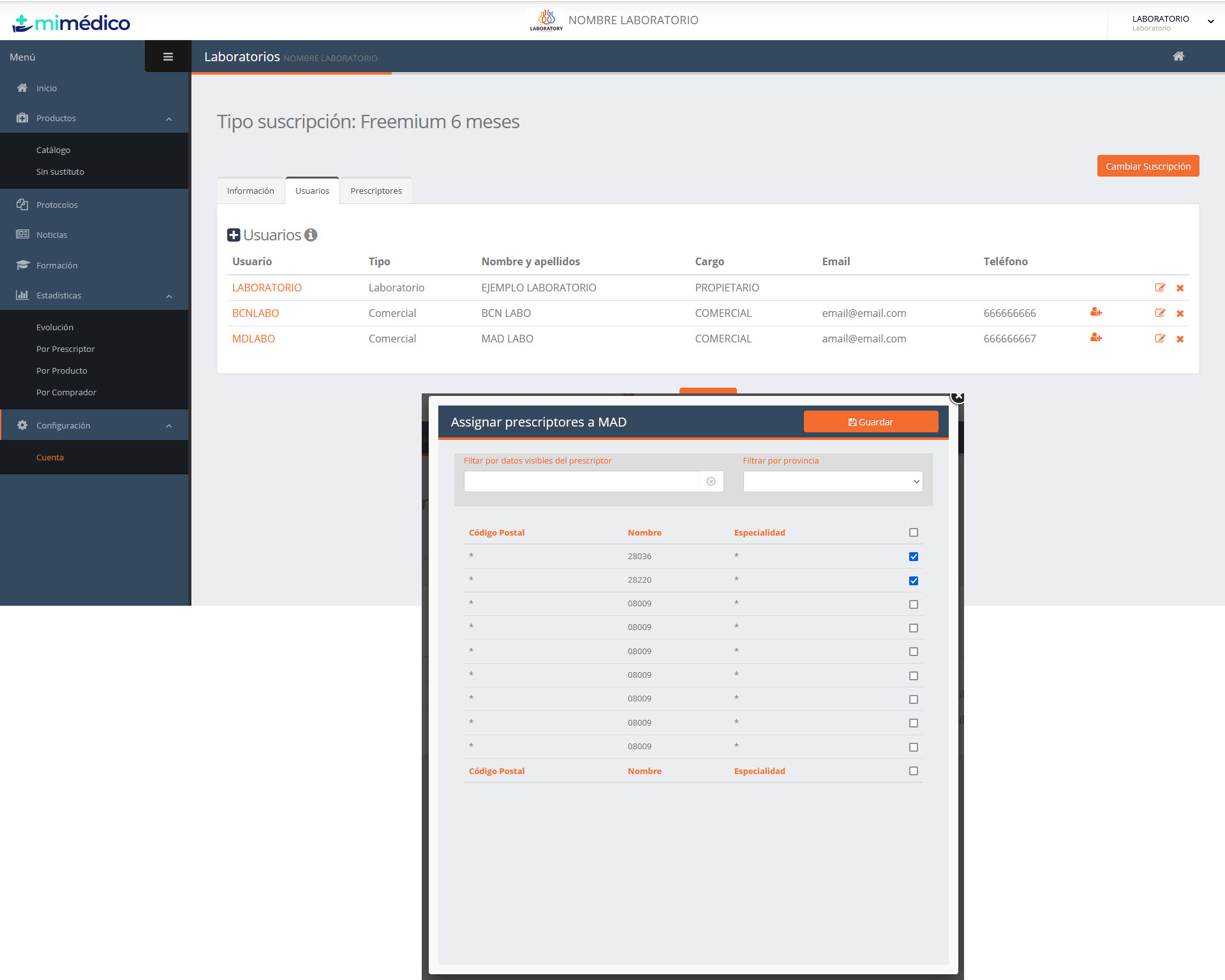 07-02-2024_12-08-26A partir de ahora, los laboratorios podrán crear usuarios en la intranet de laboratorios de MiMedico.com para que puedan consultar, a tiempo real, las estadísticas de Prescripción / Primera venta / Repetición de venta por cada uno de sus prescriptores. Sólo verán aquellos prescriptores que les hayamos asignado, ya sea por nombre o por código postal o filtrando por población.¿Con qué finalidad?1- Visita comercialPoder ver el detalle de prescripción antes de entrar en una visita comercial, para conocer el perfil de la persona que visito: - Cuanto prescribe? - Cuanto Vende? - Qué productos prescribe? Así podremos afinar en: el tiempo y esfuerzo que le dedicamos, la presentación de productos que no este usando, etc..2- Variables de venta: La vista global de ventas por fecha, les permitirá conocer y calcular sus variables mensuales / trimestrales y tener total trazabilidad y transparencia